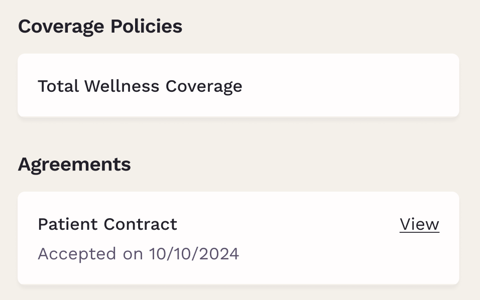 The Patient App offers an organized view of all membership details, including billing information, coverage policies, and any agreements signed and linked to a membership plan. Agreements can be viewed or downloaded directly from the membership screen, ensuring important documents are easy to access.
